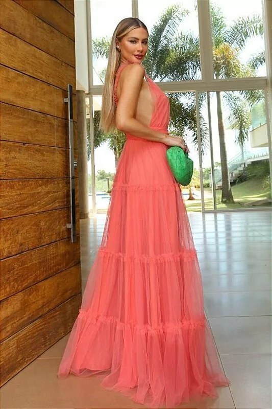 Vestido em tule seco com decote em V, alças finas, costas transpassadas e modelo evasê. Com bojo e ziper invisível.
