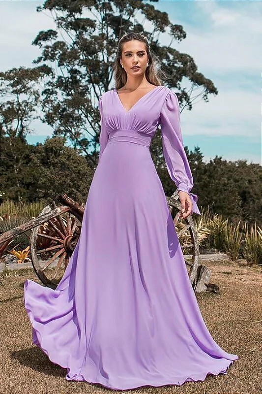 Vestido de festa longo com manga longa detalhe vazado, zíper invisível lateral, com bojo e forro. Tecido de chiffon, sem elastano, cintura marcada e saia evasê.