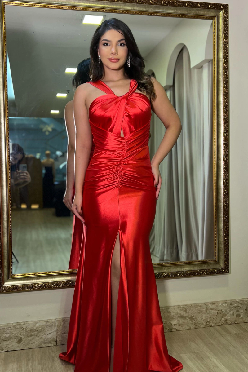 Vestido longo em cetim vermelho vibrante, com modelagem justa que valoriza as curvas. O busto possui recorte torcido com alças cruzadas, criando um decote moderno e sofisticado. O drapeado frontal alonga a silhueta e a fenda frontal confere um toque sensual e elegante. Um look marcante para formaturas, festas ou eventos noturnos especiais.