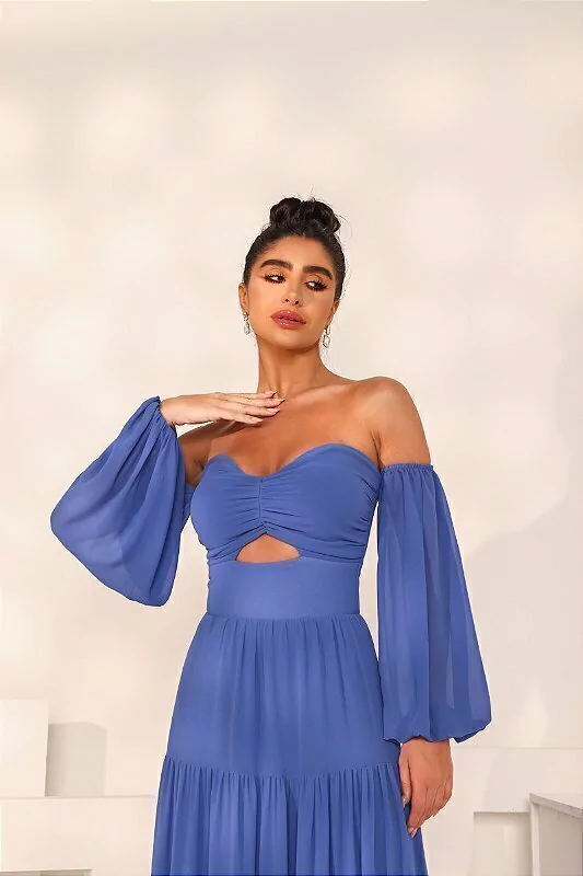 Vestido ombro a ombro estilo ciganinha, decote coração com detalhe vazado, cintura marcada e saia evasê em camadas. Tecido crepe.