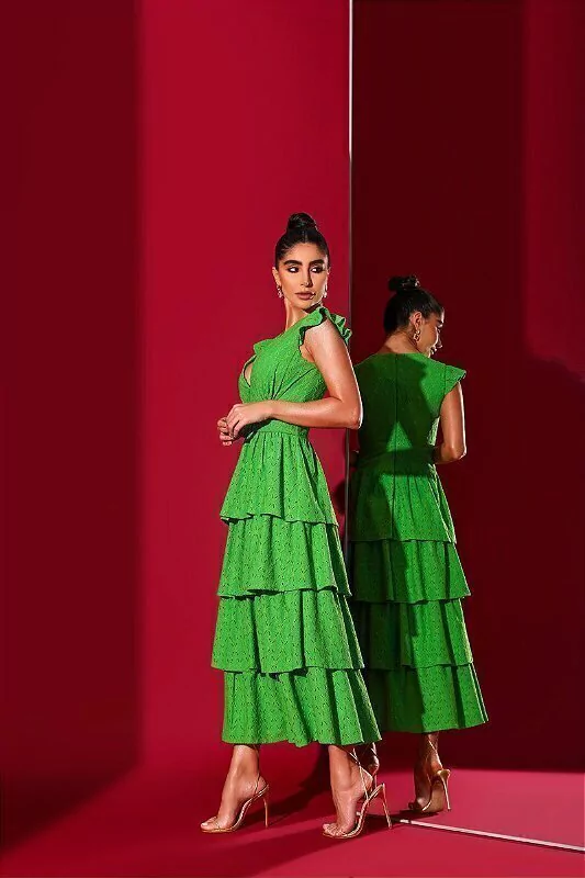 Vestido de Laise, com manguinhas, bem acinturado, todo em camadas. Vestido leve e fluido, saia evasê bem romantico. Perfeito para todas as ocasiões.