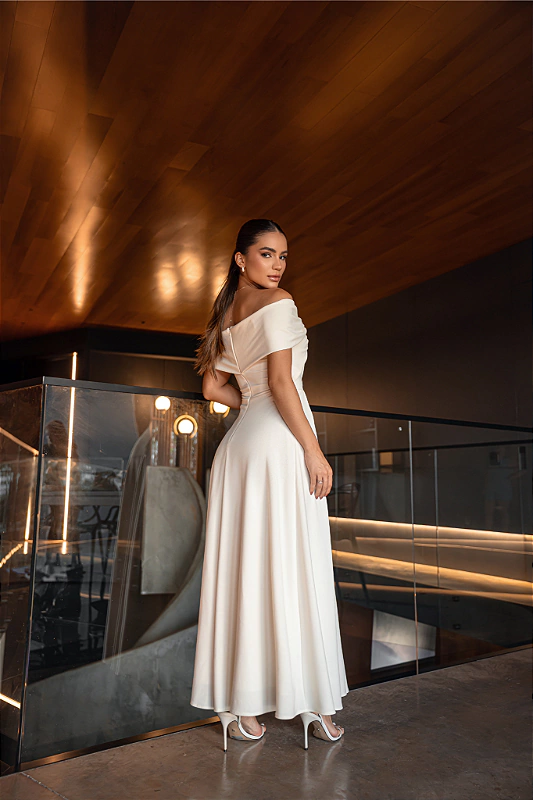 Vestido miid crepe acetinado com elastano, bojo, zíper invisivel nas costas.Decote ombro a ombro.