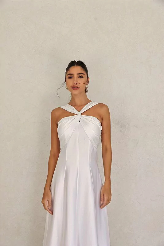 Vestido de festa midi em crepe encorpado com elastano e decote . Possui bojo e elastano, e zíper nas costas.