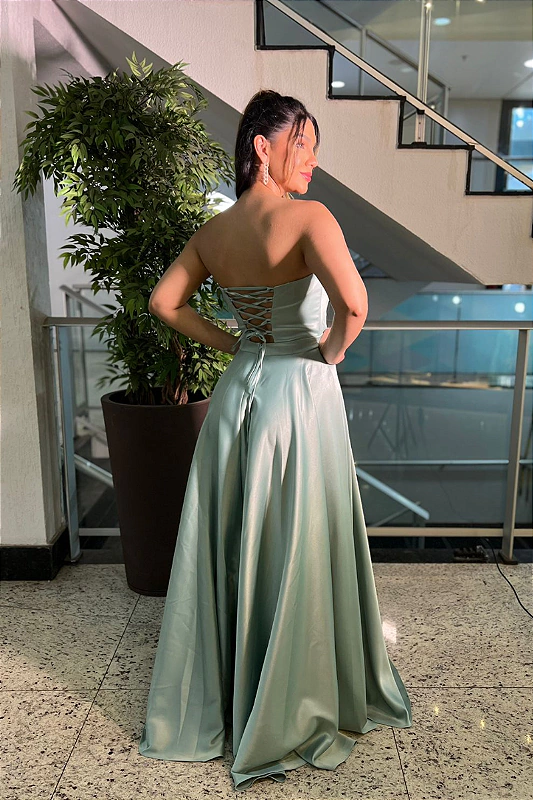 Vestido longo acetinado sem alças com corpete estruturado, fenda, ziper invisivel e ajuste nas costas.